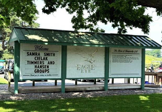 After breakfast, we departed the Crystal Mountain Resort for the 3-hour drive to Bath (near East Lansing) for our final round of the trip at the Eagle Eye course. We tried to get a round in at Eagle Eye in 2022 but were monsooned out. Check with Mr. Gagliano if you’d like a blow-by-blow on the rainout. The stuff of legend.