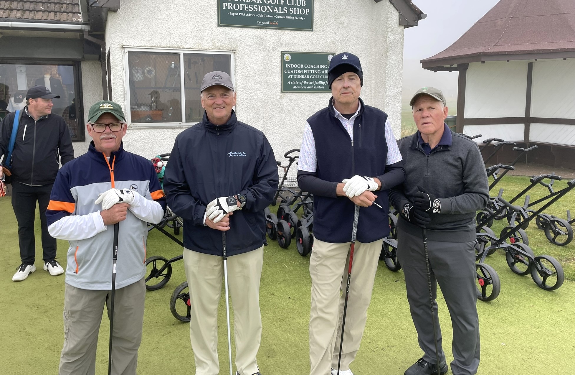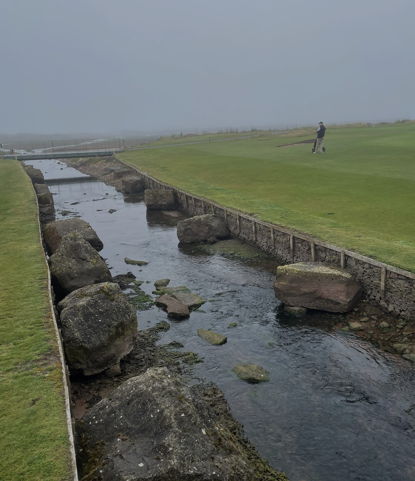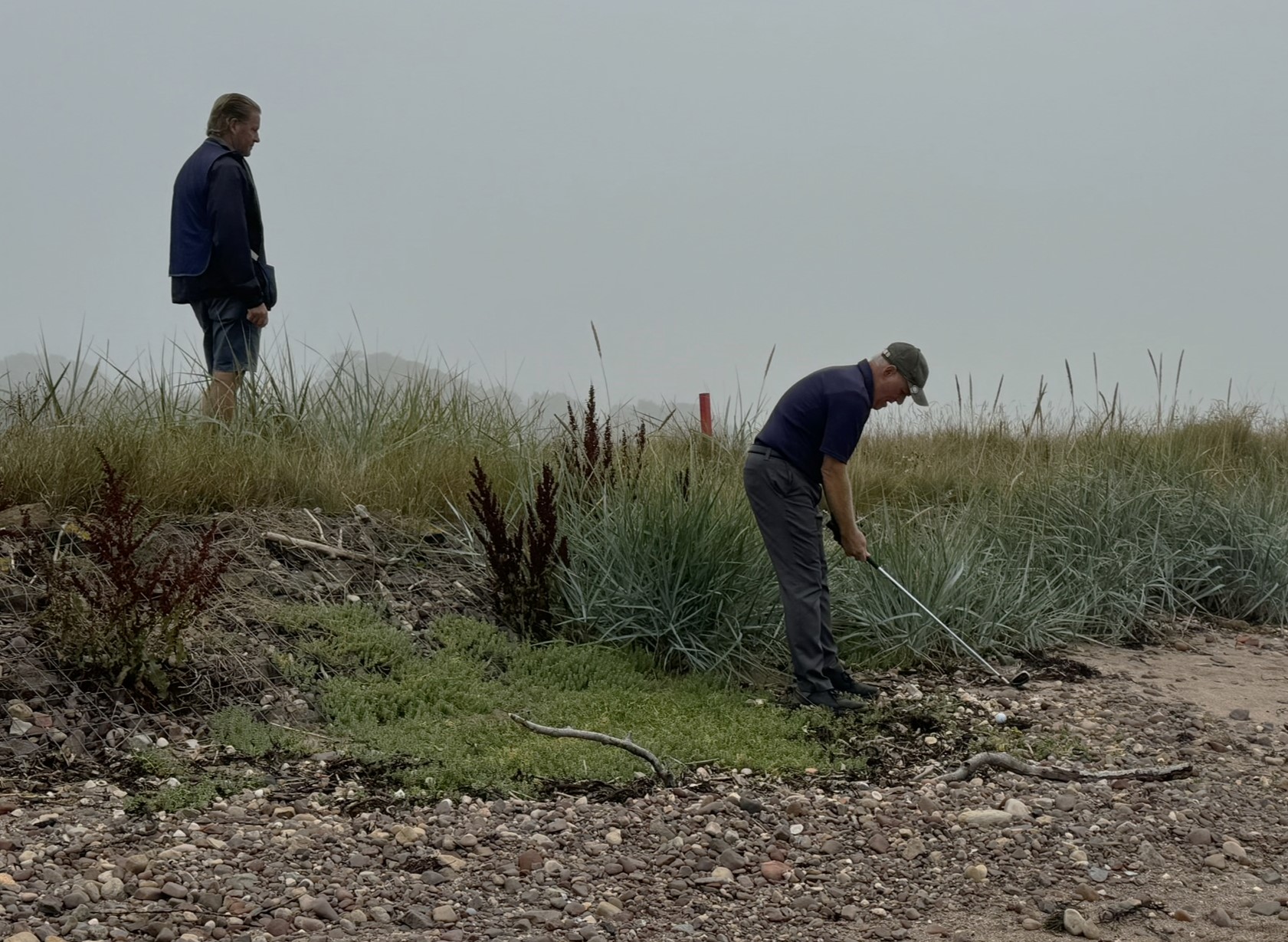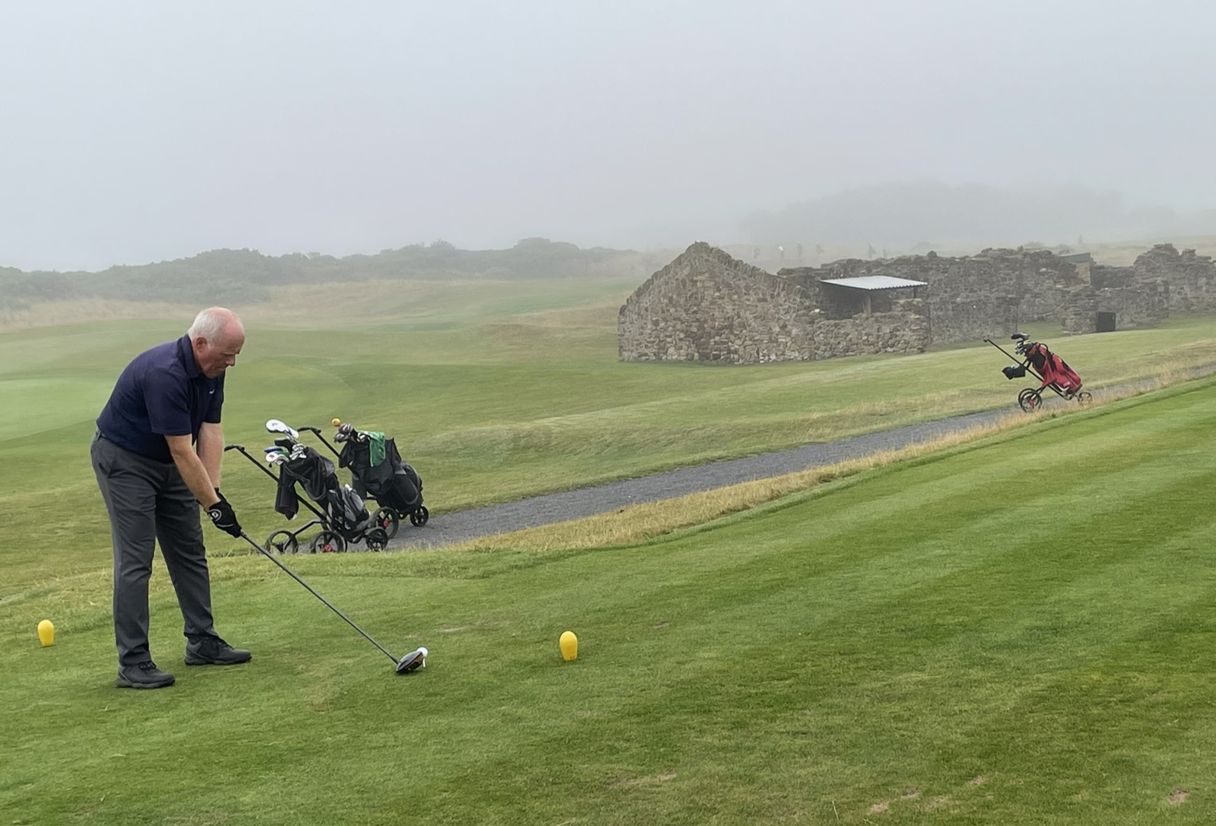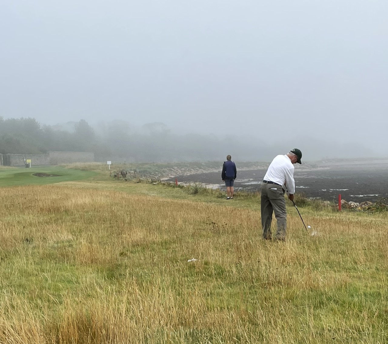 The narrow track runs between a sandstone estate wall and the rocky shoreline. Wind is always a factor. What should have been spectacular water views were obscured by what the Scots call ‘haar’ – a dense, cold sea fog. We could hear the water but only had a few visuals. Such a shame. Kevin and Mike had some great shots – Kevin from the beach, Mike from a ‘kelp lie’. Our caddy, Woody, was a little different to say the least but kept us on the right path and found our wayward balls!