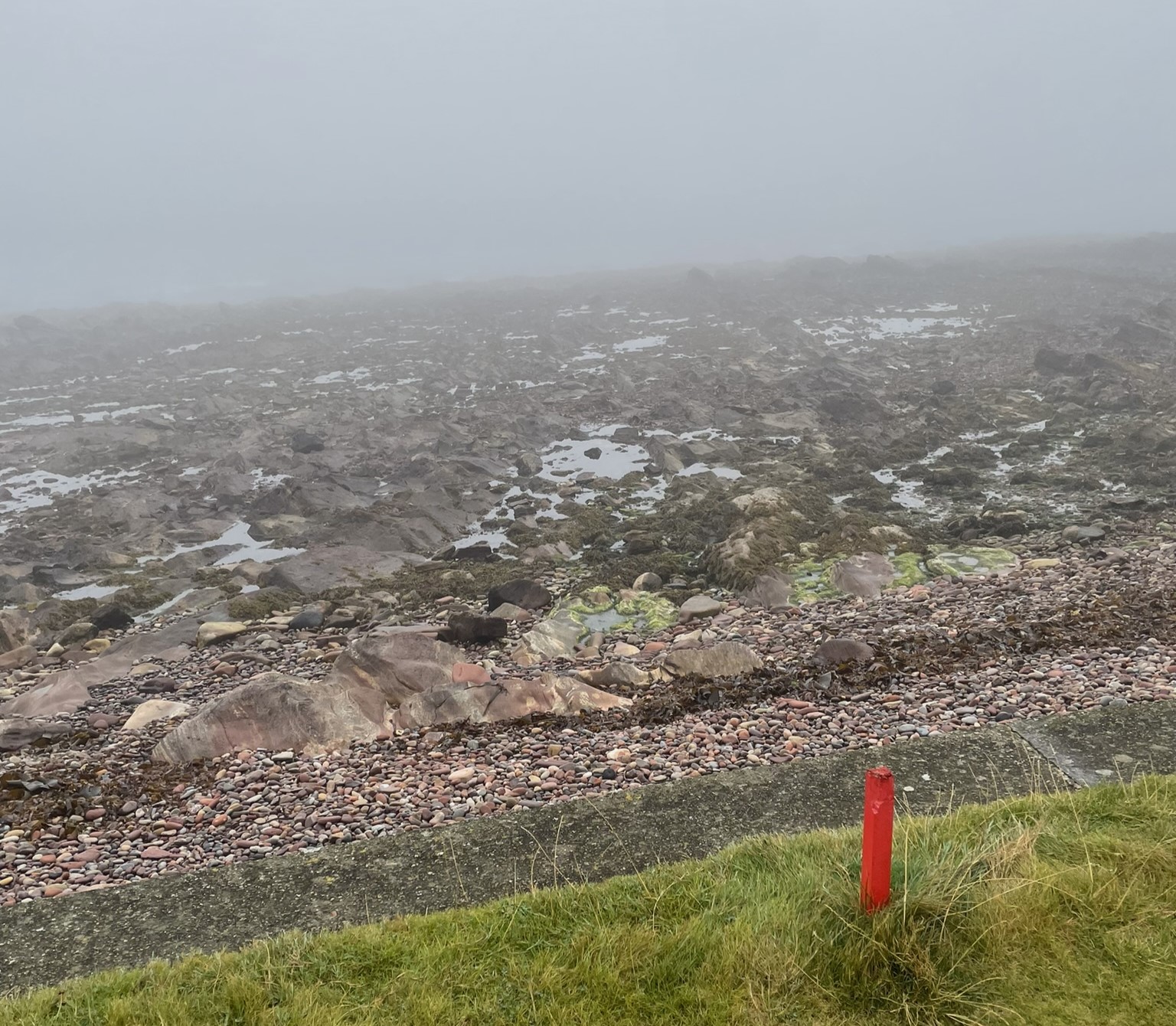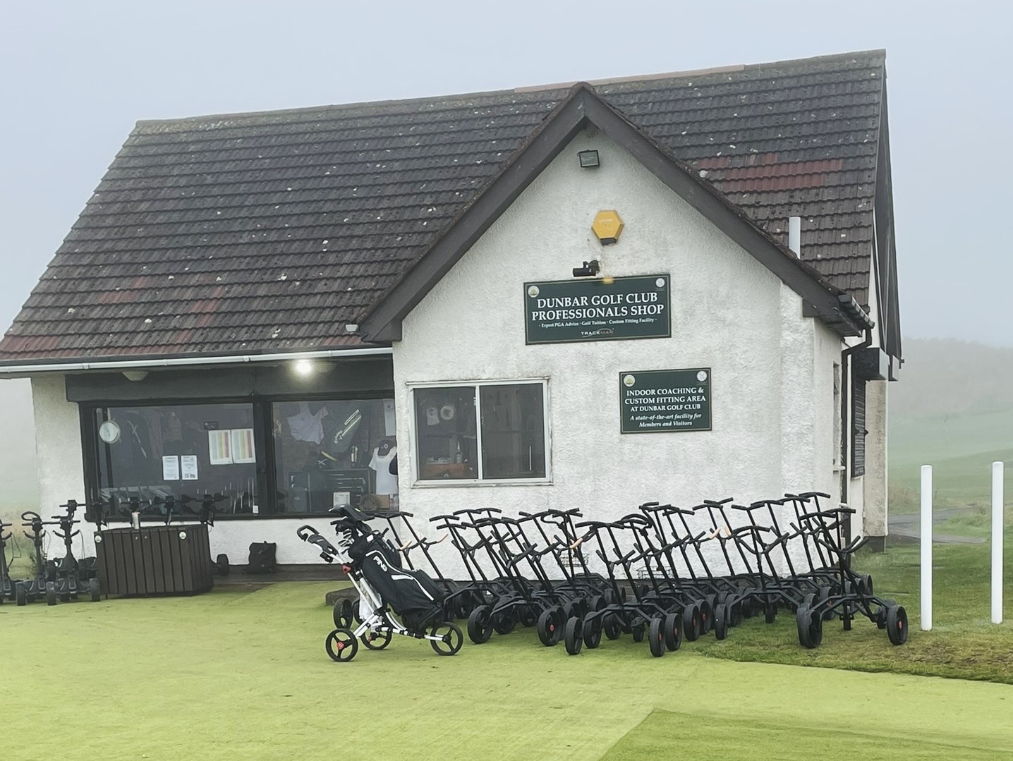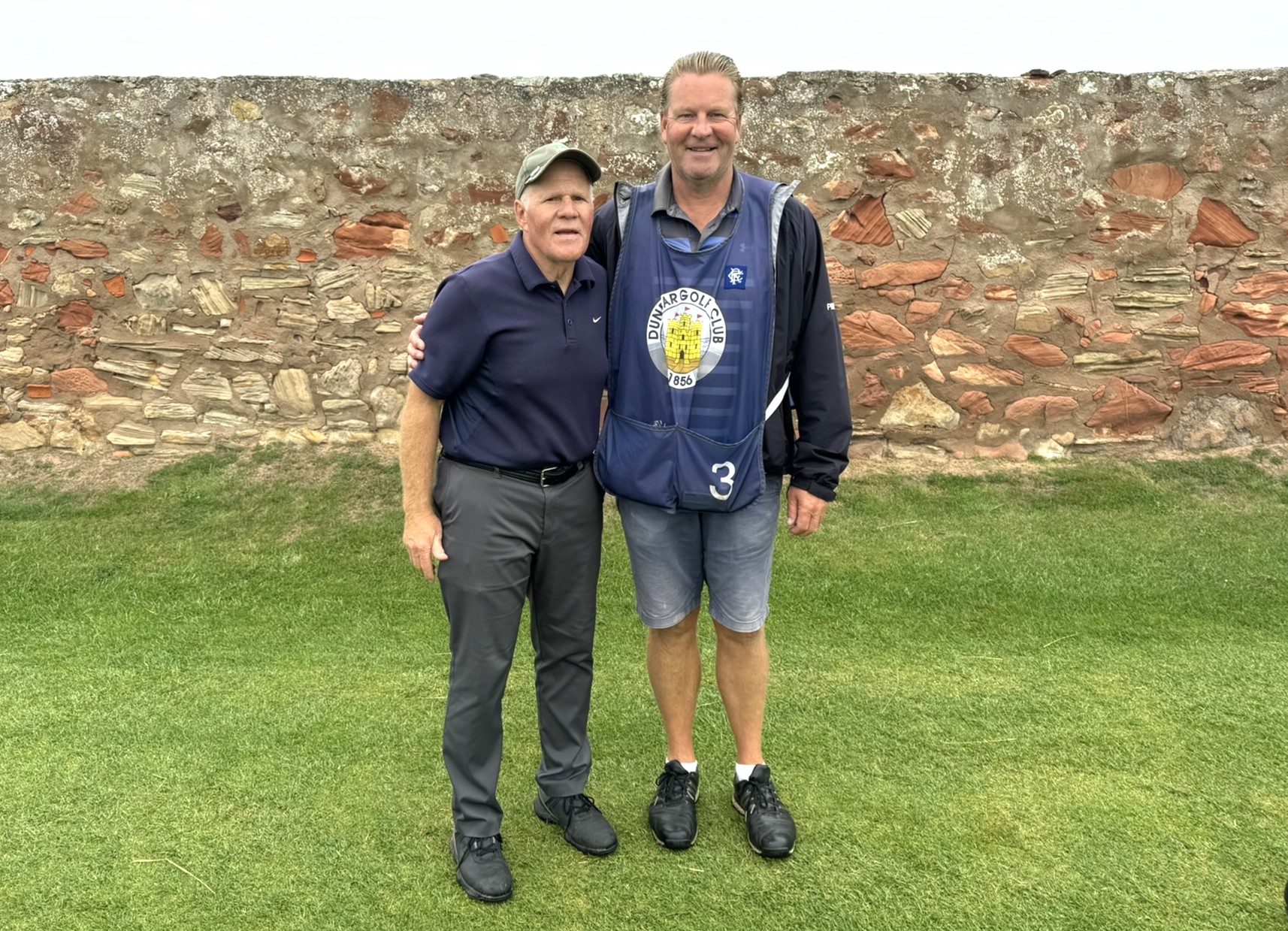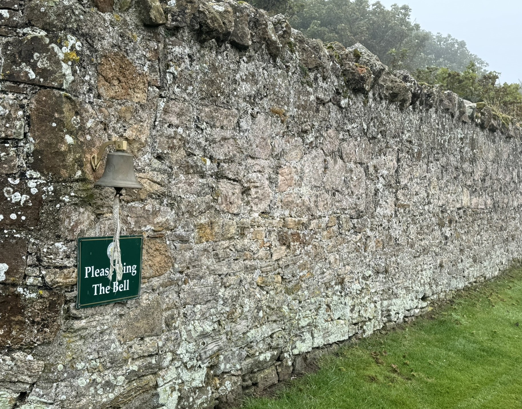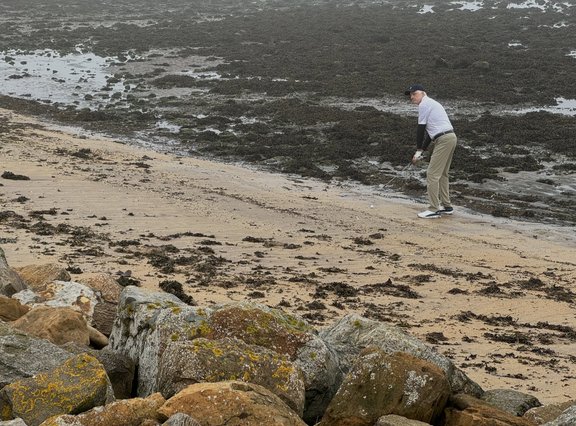 The narrow track runs between a sandstone estate wall and the rocky shoreline. Wind is always a factor. What should have been spectacular water views were obscured by what the Scots call ‘haar’ – a dense, cold sea fog. We could hear the water but only had a few visuals. Such a shame. Kevin and Mike had some great shots – Kevin from the beach, Mike from a ‘kelp lie’. Our caddy, Woody, was a little different to say the least but kept us on the right path and found our wayward balls!